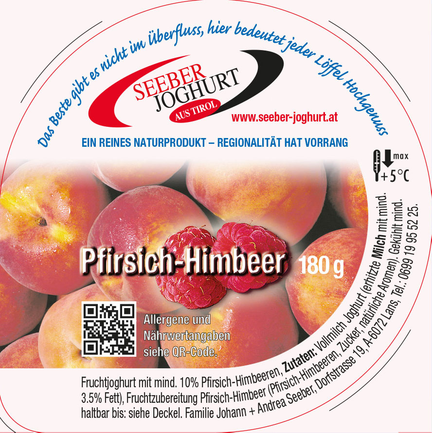Fruchtjoghurt mit mind. 7,3 % Pfirsich-Himbeer, Zutaten: Vollmilch Joghurt Allergen: Milch (erhitzte Milch mit mindestens 3,5 % Fett (natürlicher Fettgehalt), Fruchtzubereitung Pfirsich-Himbeer (Pfirsich-Himbeeren, Zucker, natürliche Aromen), Zucker. Ungeöffnet gekühlt mind. haltbar bis: siehe Deckel. Vor und nach dem Öffnen gekühlt lagern. Nach dem Öffnen sofort verbrauchen